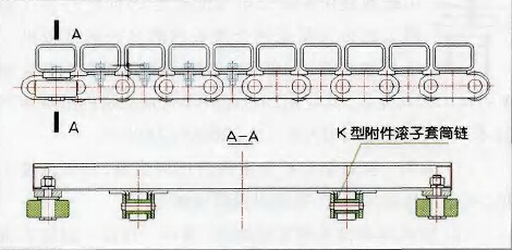 原平板輸送鏈條的結(jié)構(gòu)如圖2,鏈條由帶K型附件的滾子套筒鏈和方管鋼面板組成,鏈條傳動時,套筒沿著軸滑動,增加了功率的消耗。